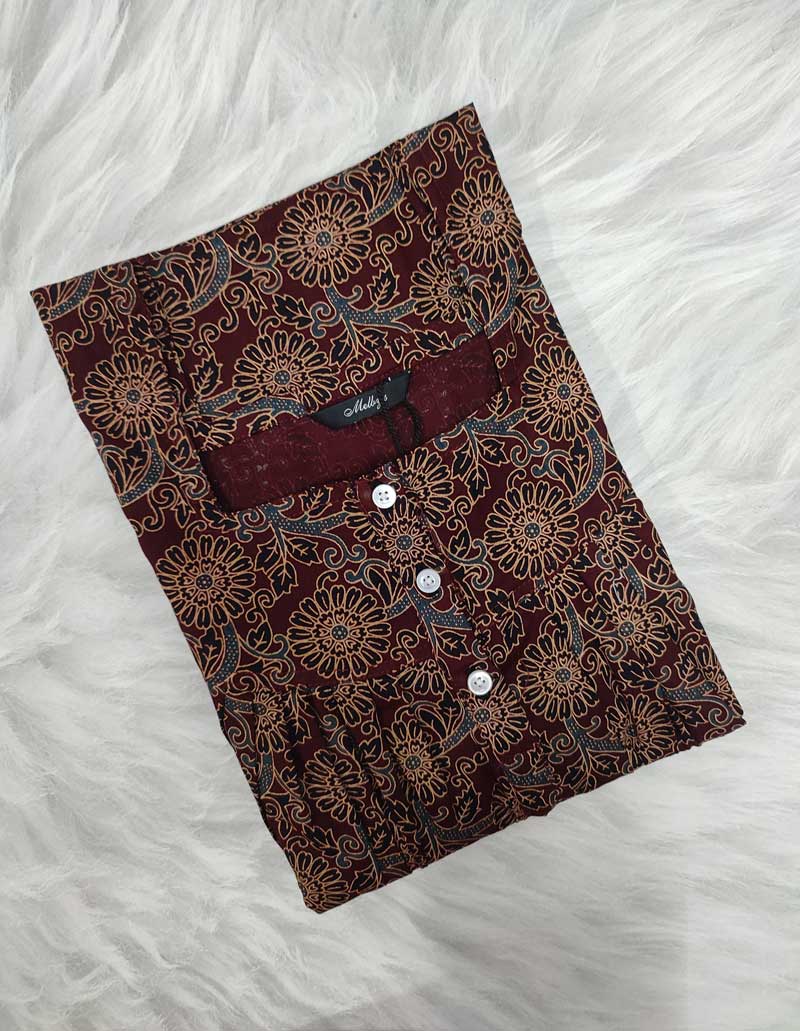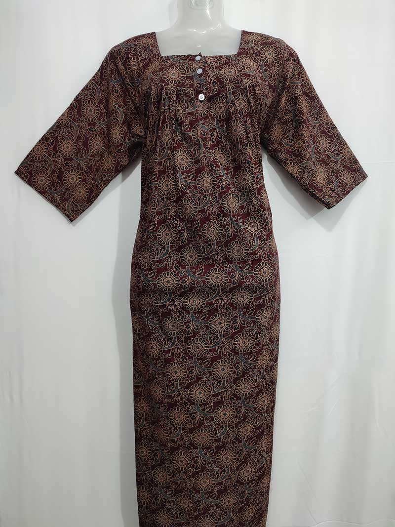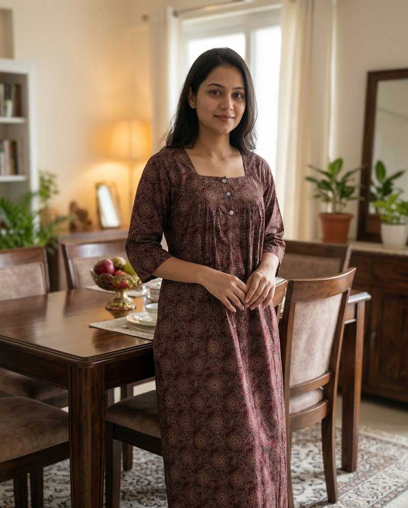 Comfortable Churidar Model Ajrakh Nighty, 55 Inches Long, 3/4th Sleeves – Maroon