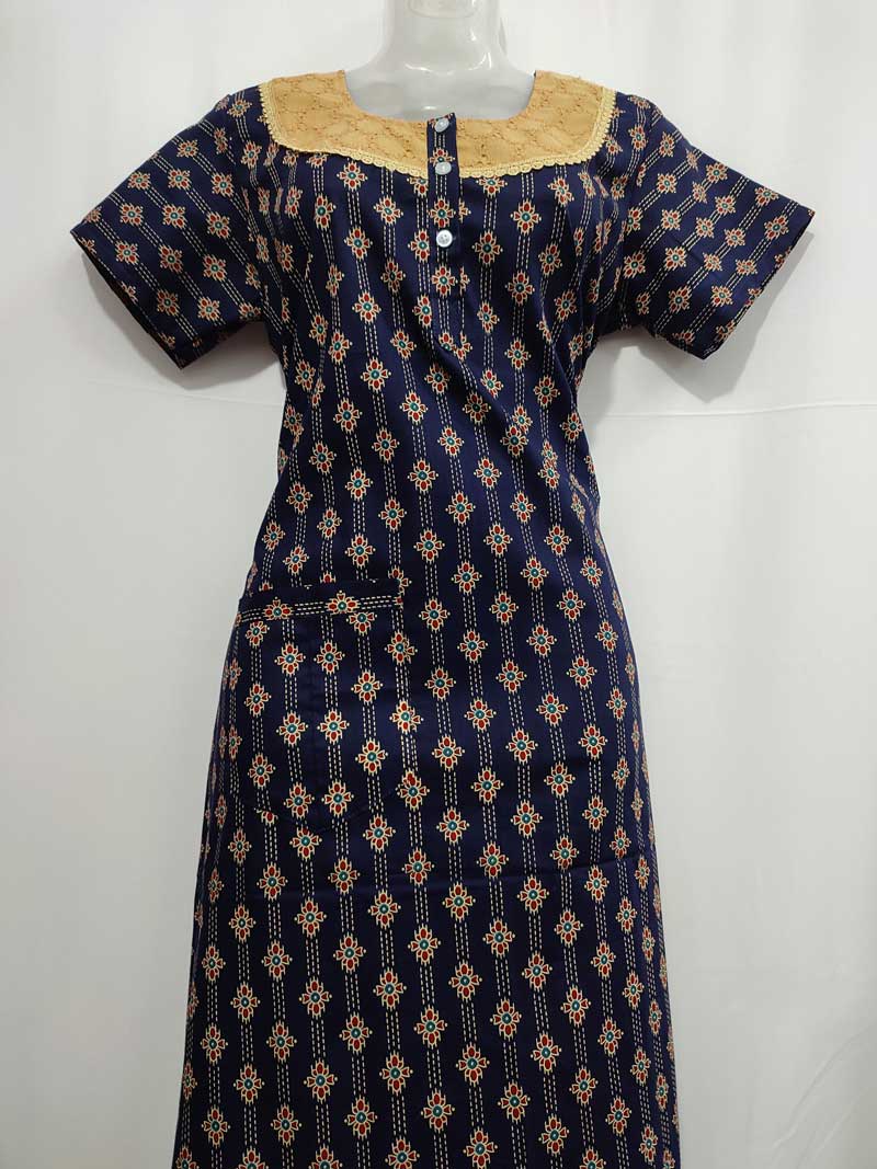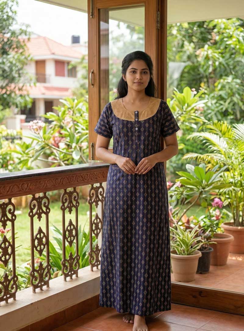Comfortable Churidar Model Ajrakh Nighty, 55 Inches Long, Hacoba Yoke – Dark Blue