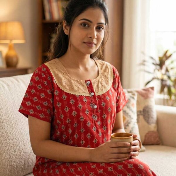 Comfortable Churidar Model Ajrakh Nighty, 55 Inches Long, Hacoba Yoke – Red – L