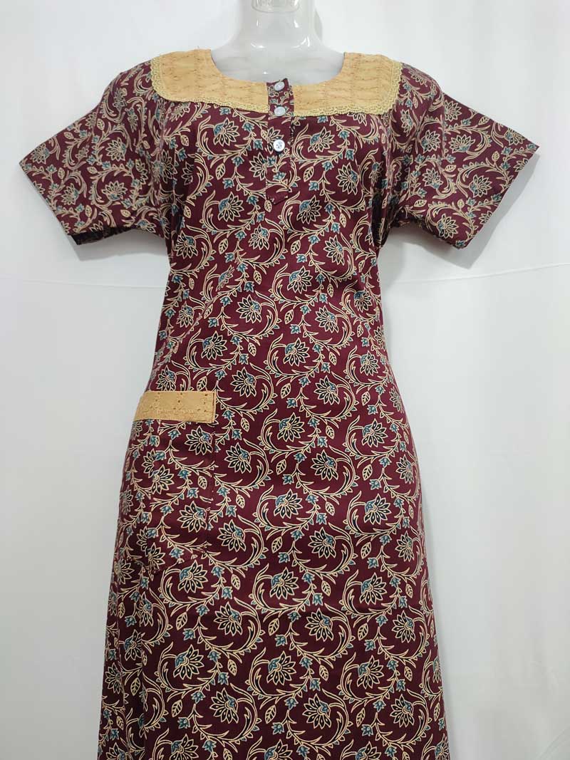 Front Open Cotton Nighty With Buttons, 55 Inches Long – Maroon