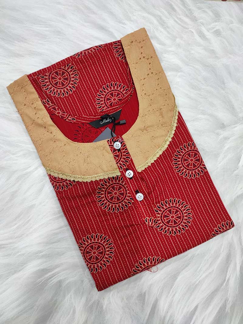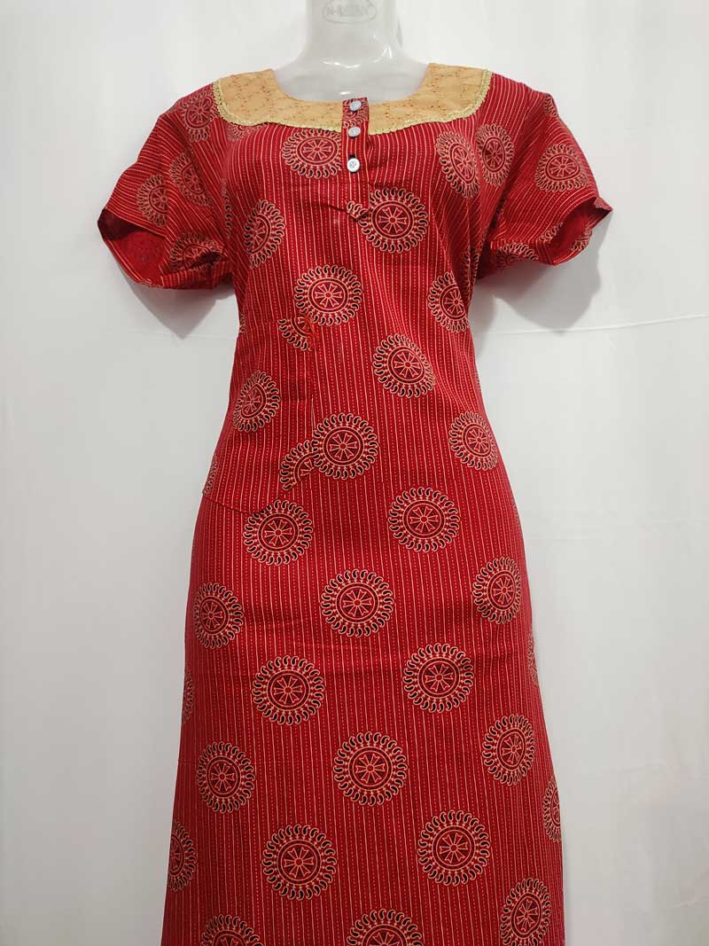 Collar Neck Cotton Nighty With Buttons – 55 inches long – Red