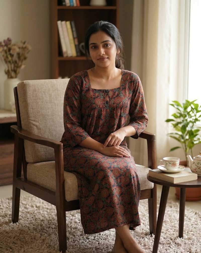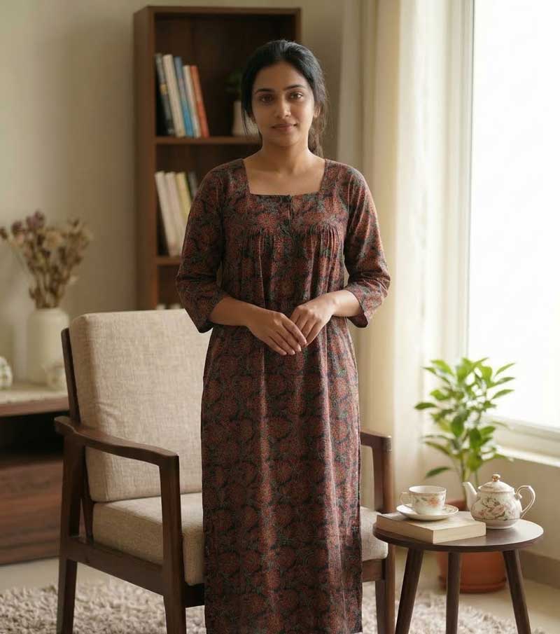 This nighty can be hand washed or a normal machine washed with cold water. Please make sure to dry the nighty in a light shade away from direct sunlight.