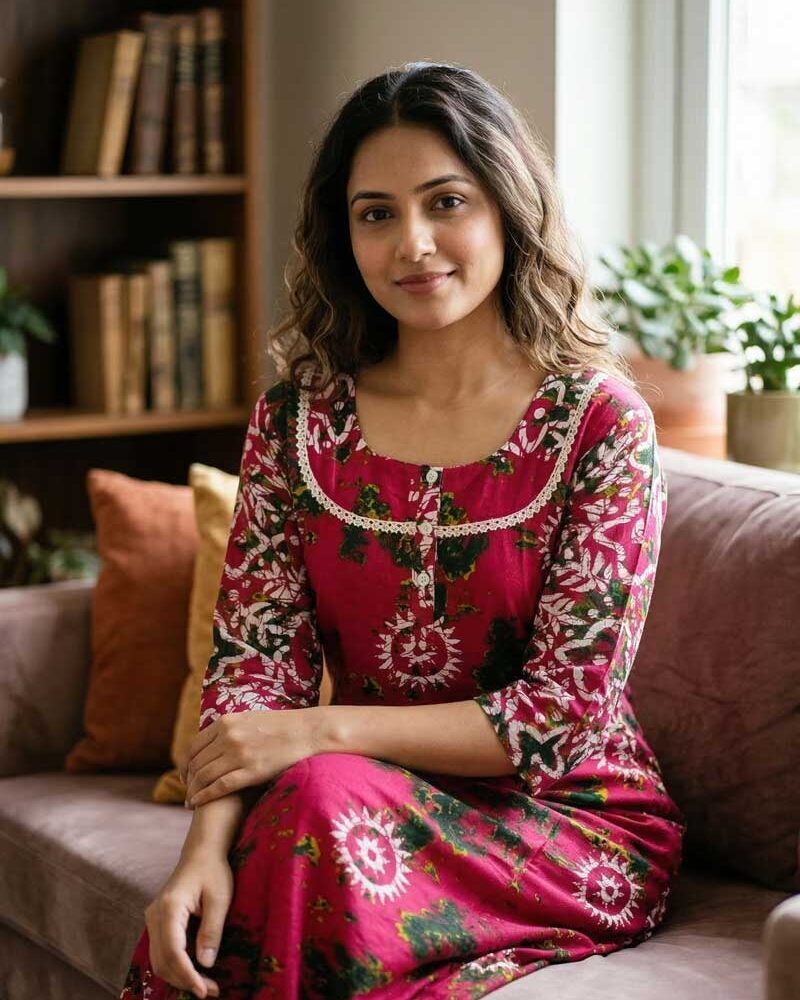 Comfortable Churidar Model Ajrakh Nighty, 55 Inches Long, 3/4th Sleeves, Hacoba Yoke – Red – M