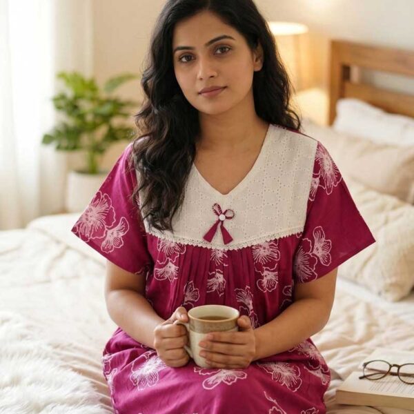 Traditional Cotton Nighty, 55 Inches Length, Hacoba Yoke – Magenta – XL