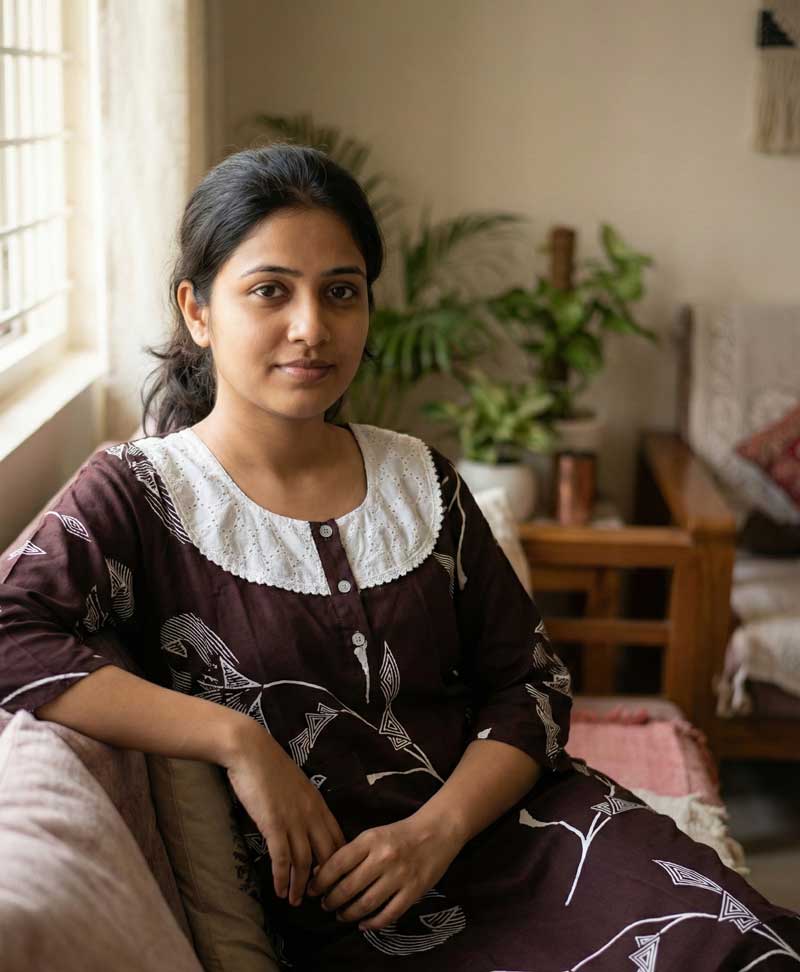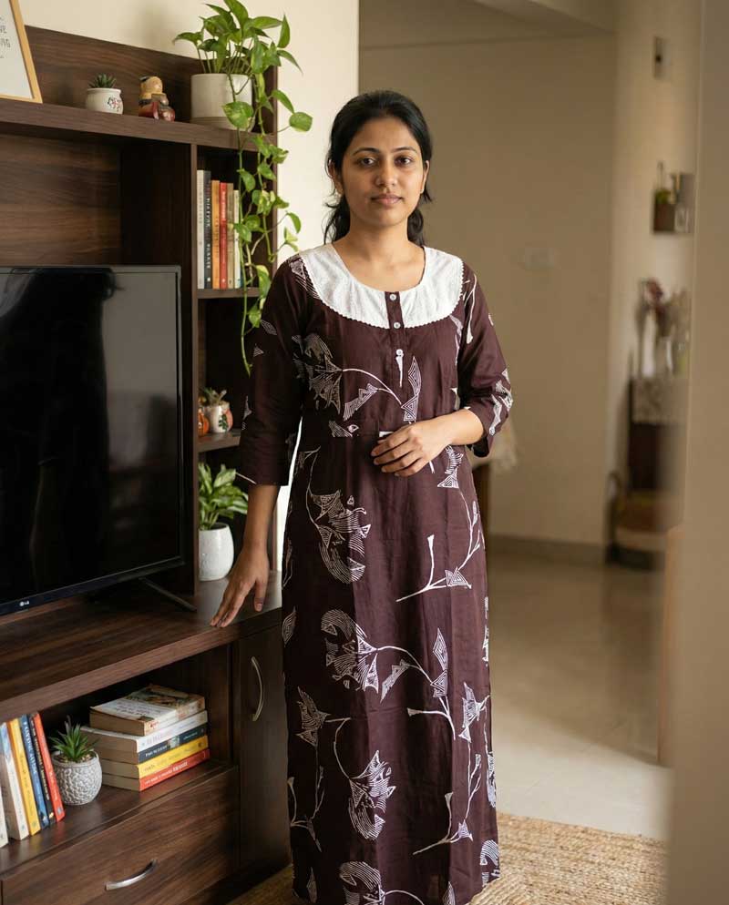 This nighty can be hand washed or a normal machine washed with cold water. Please make sure to dry the nighty in a light shade away from direct sunlight.