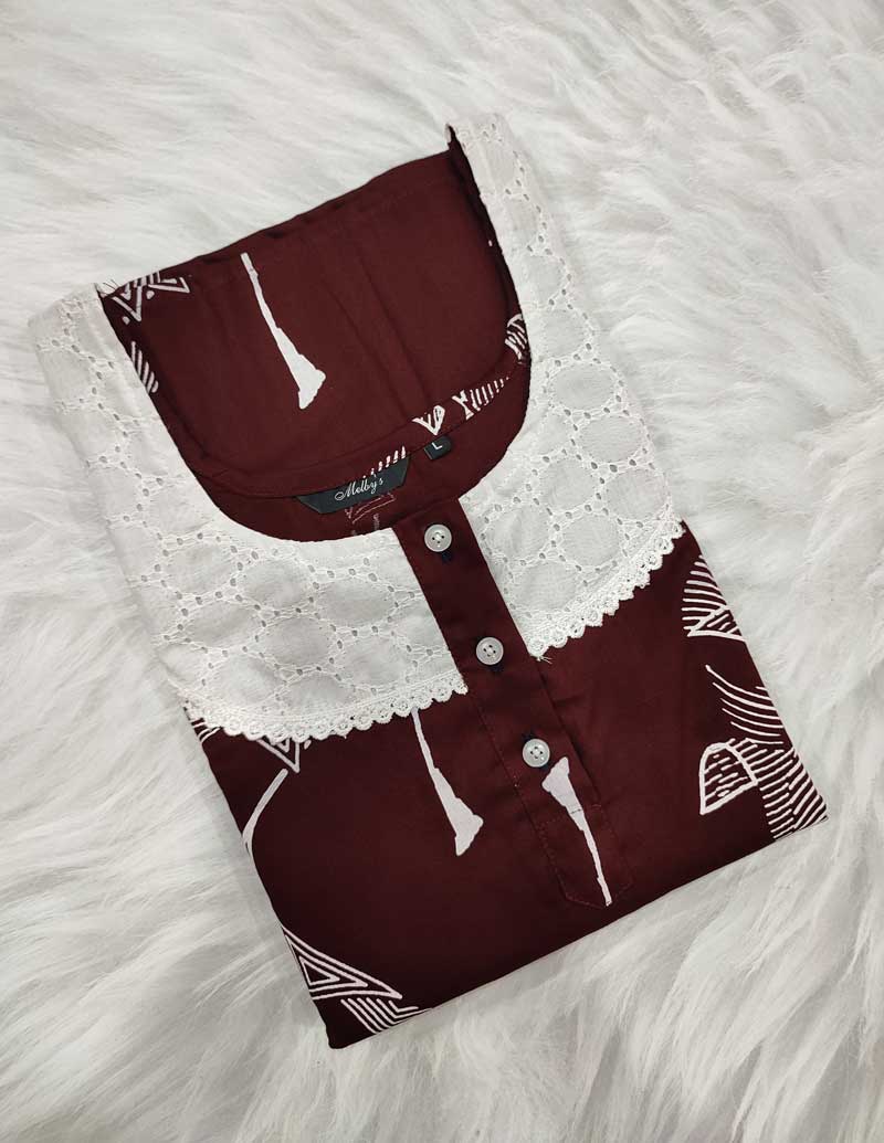 Comfortable Front Open Ajrak Nighty With Buttons- 55 inches long – Maroon