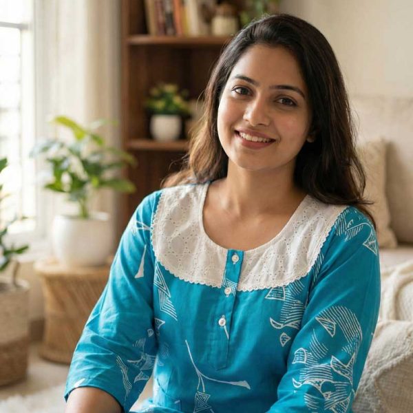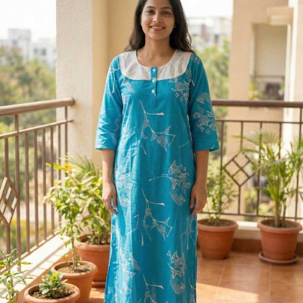 Comfortable Churidar Model Cotton Nighty, 55 Inches Long, 3/4th Sleeves – Blue