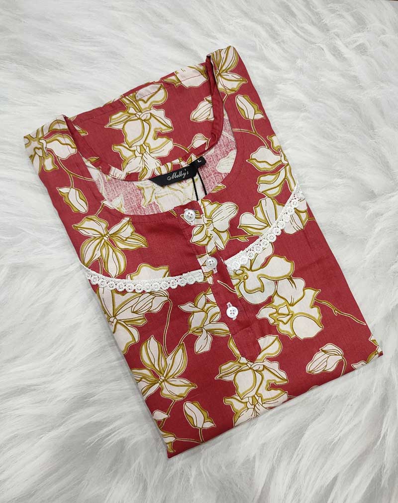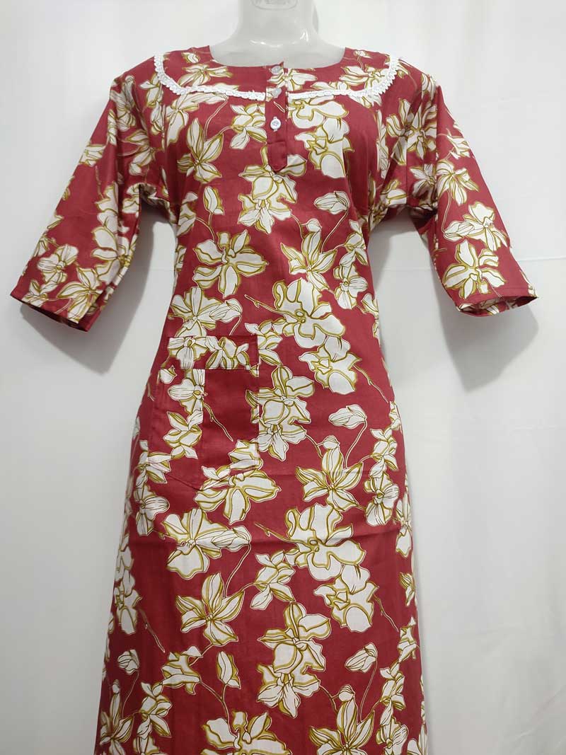 Collar Neck Cotton Nighty With Buttons – 55 inches long – Red