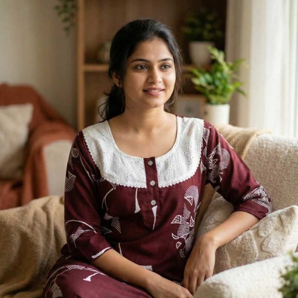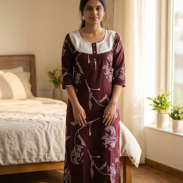 Comfortable Churidar Model Cotton Nighty, 55 Inches Long, 3/4th Sleeves – Maroon