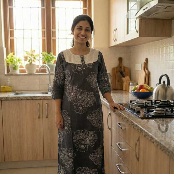 Comfortable Churidar Model Cotton Nighty, 55 Inches Long, 3/4th Sleeves – Ash colour