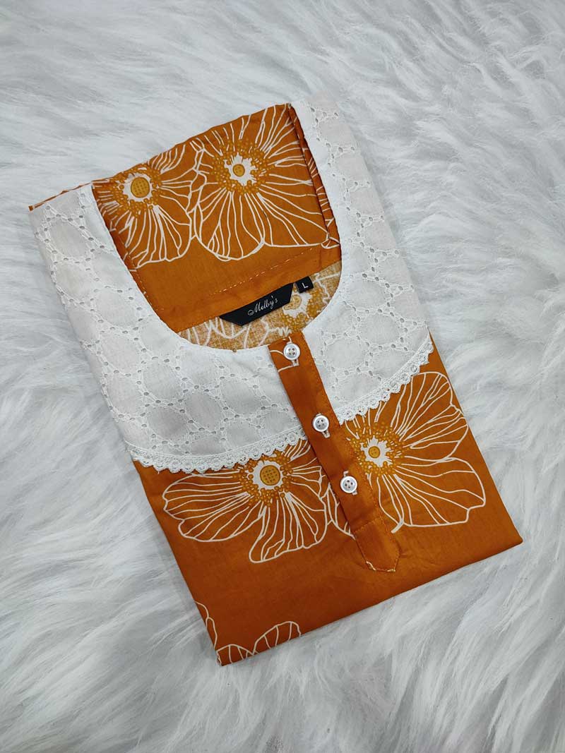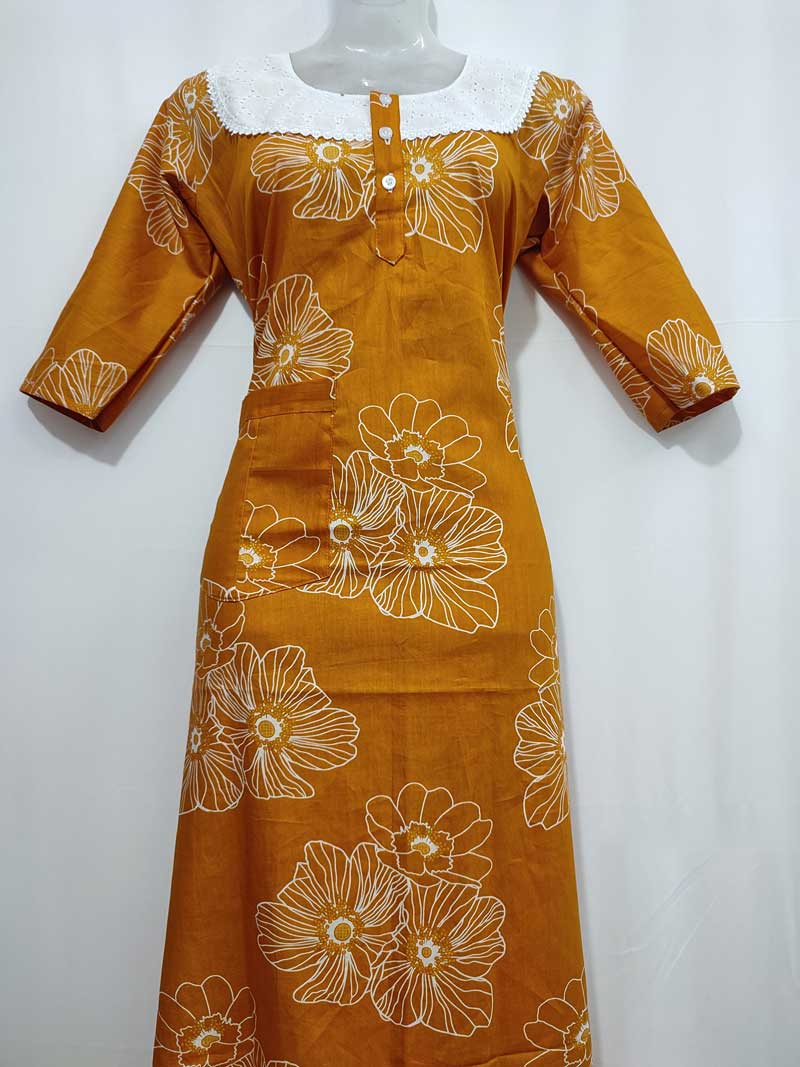 Comfortable Churidar Model Cotton Nighty, 55 Inches Long, 3/4th Sleeves – Yellow