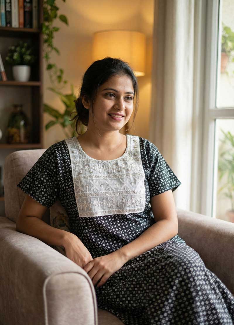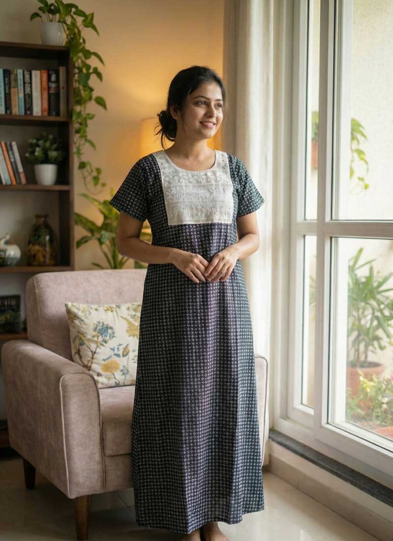 This nighty can be hand washed or a normal machine washed with cold water. Please make sure to dry the nighty in a light shade away from direct sunlight.