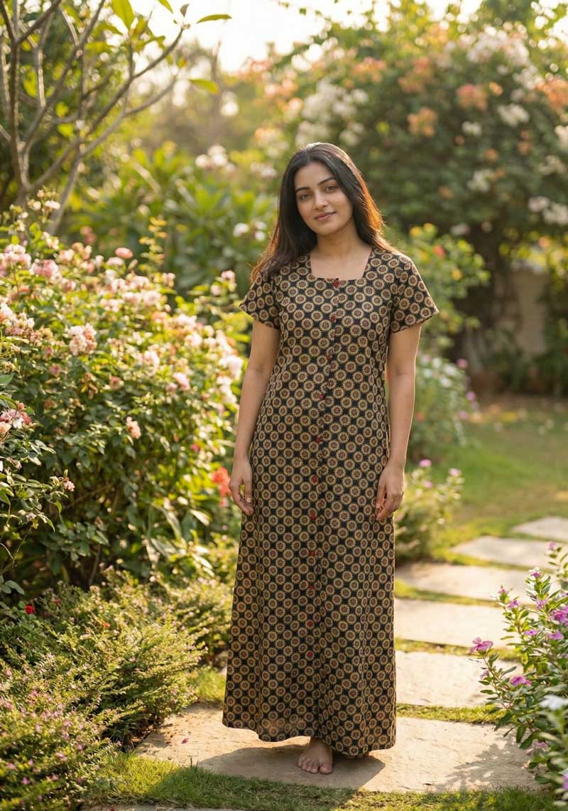 Premium Cambric Cotton Nighty With Long Sleeves – Buttons Type
