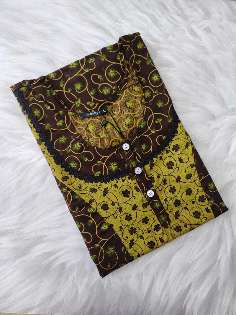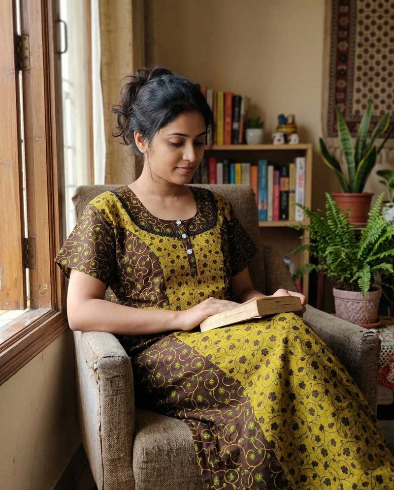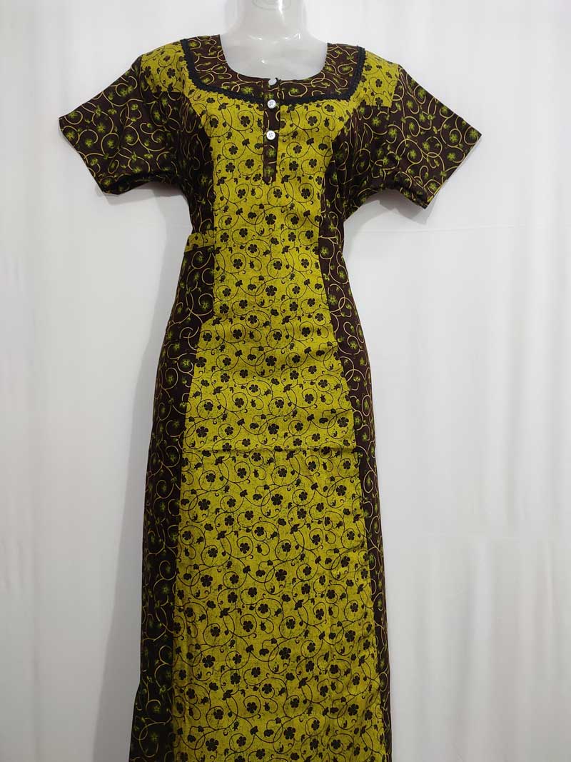 Comfortable Churidar Model Cotton Nighty, 55 Inches Long – Brown + Yellow