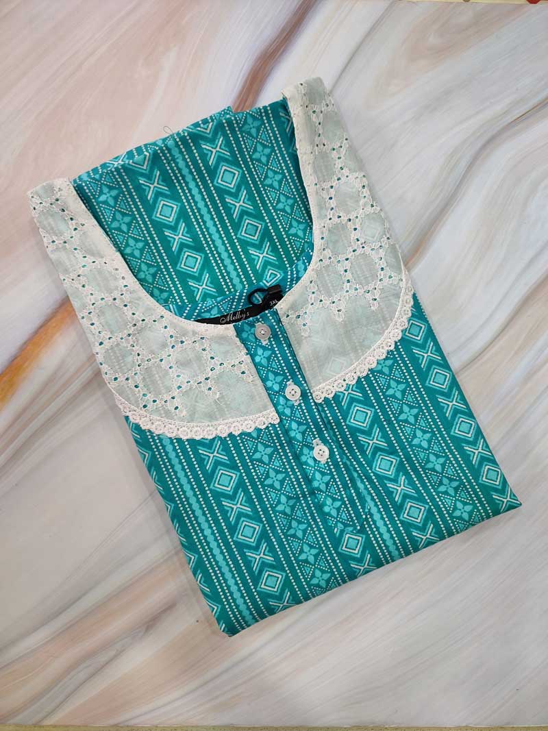 Comfortable Churidar Model Cotton Nighty, Hakoba yoke – 57 Inches Long – Green