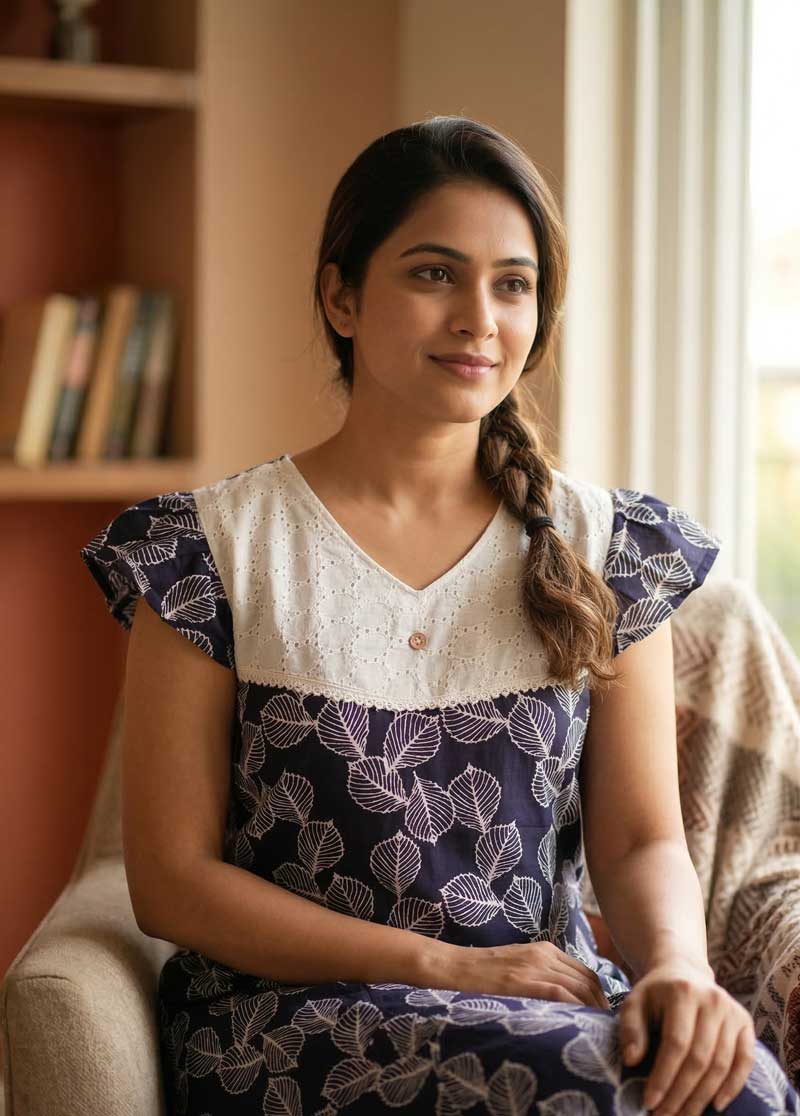 This nighty can be hand washed or a normal machine washed with cold water. Please make sure to dry the nighty in a light shade away from direct sunlight.