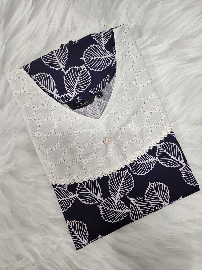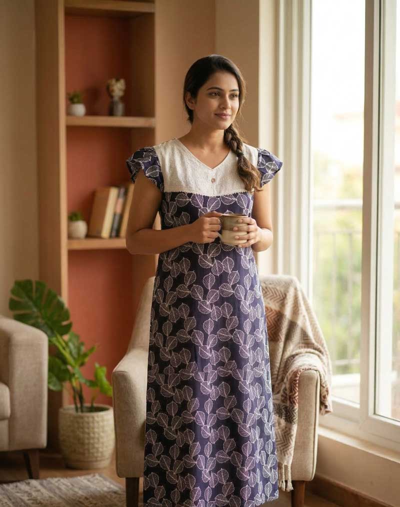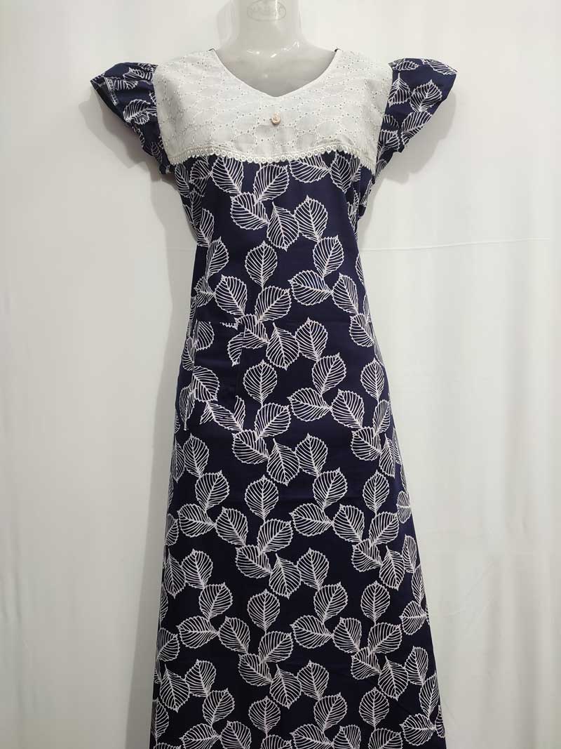 Comfortable Churidar Model Cotton Nighty, 55 Inches Long, Hacoba Yoke – Blue