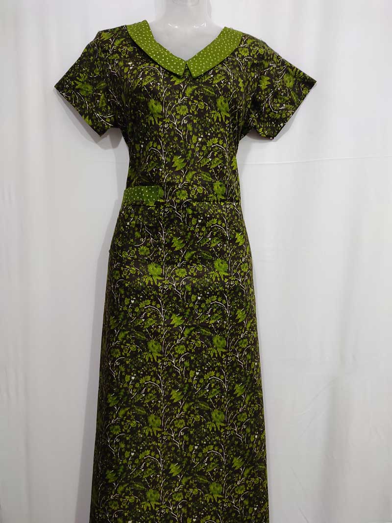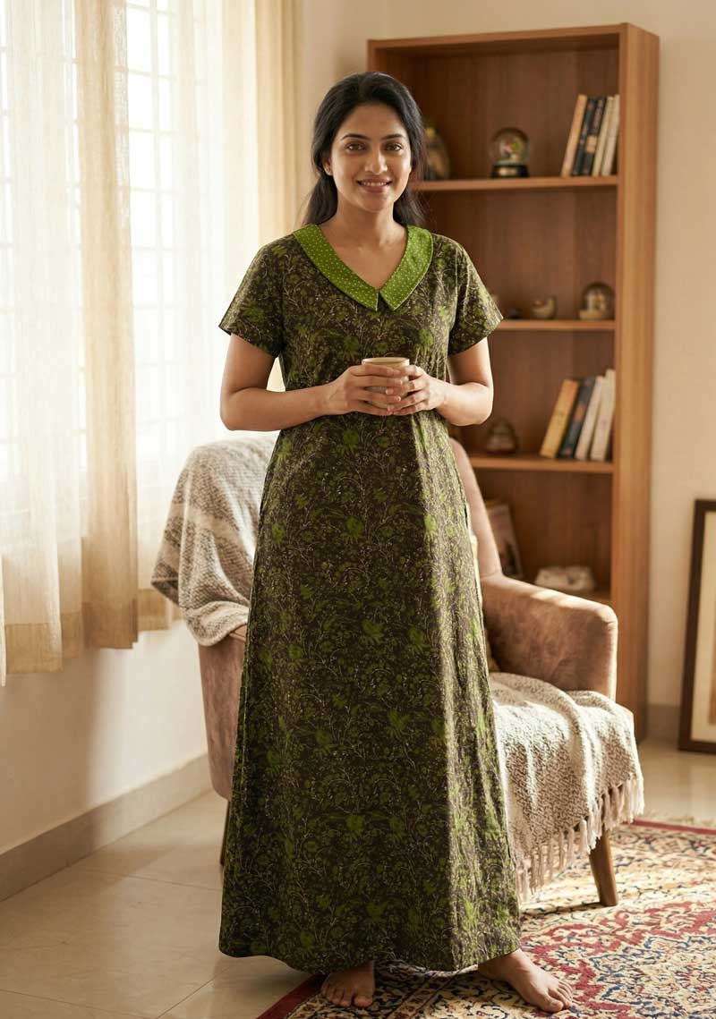 Comfortable Churidar Model Cotton Nighty, 55 Inches Long, Peter Collar – Brown