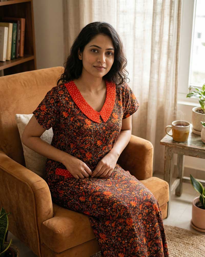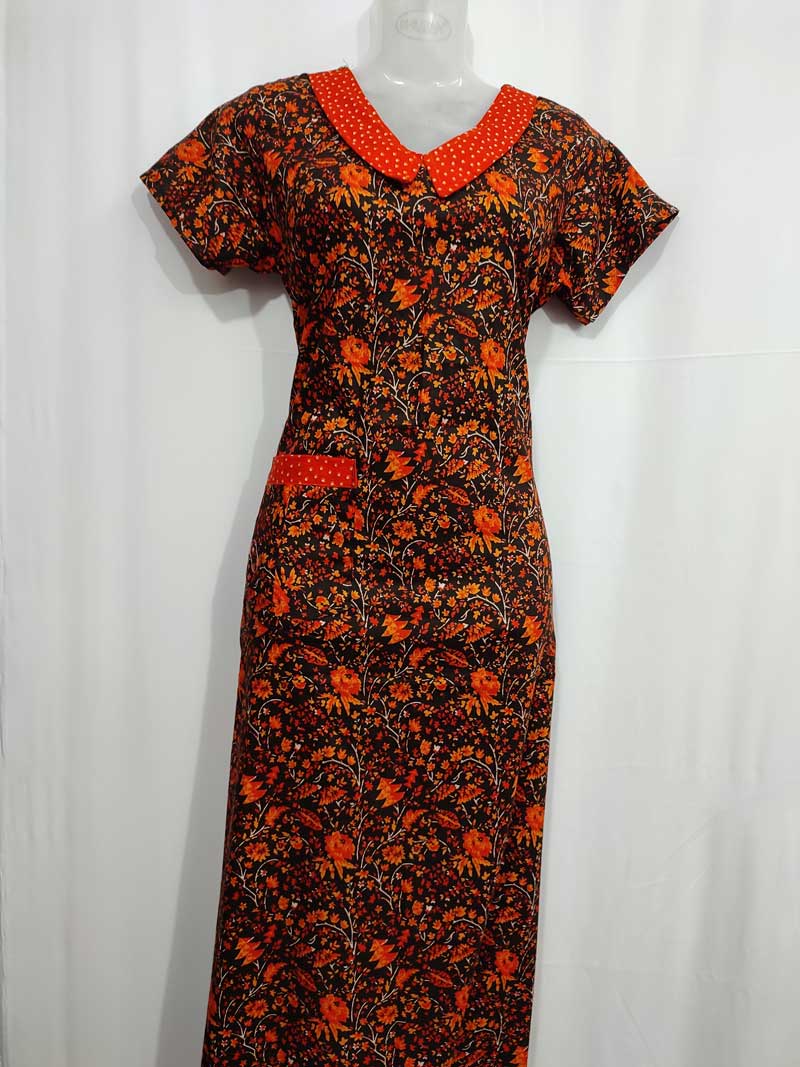 Comfortable Churidar Model Cotton Nighty, 55 Inches Long, Peter Collar – Orange + Black