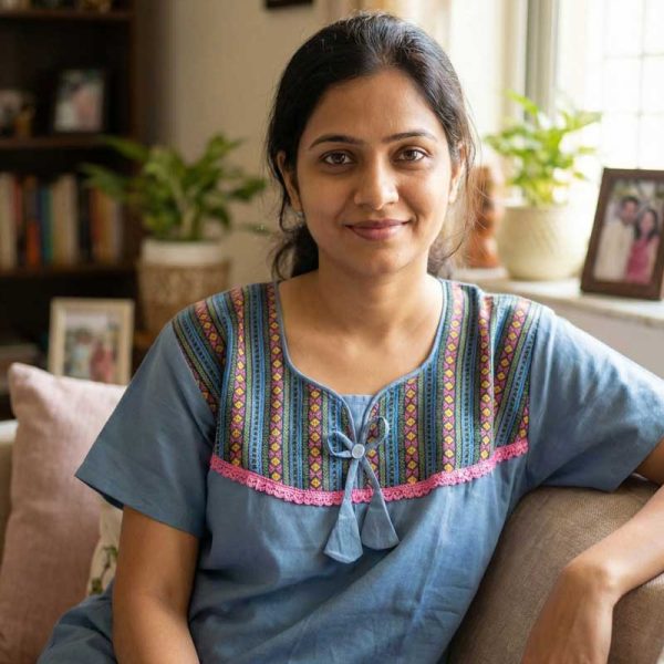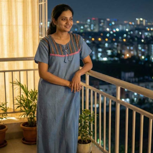 This nighty can be hand washed or a normal machine washed with cold water. Please make sure to dry the nighty in a light shade away from direct sunlight.