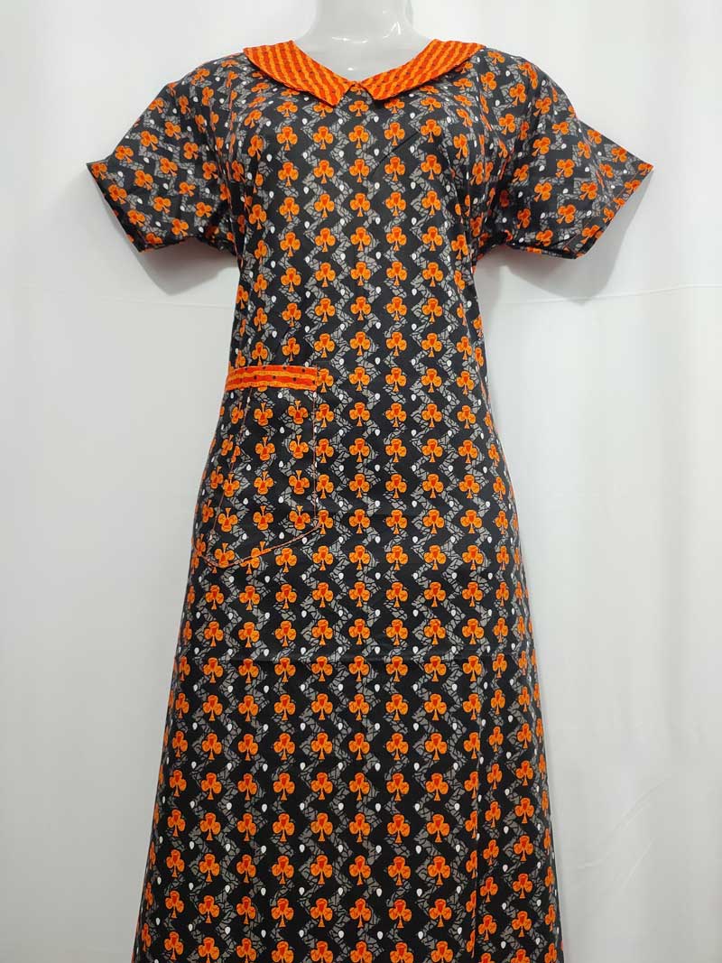 Comfortable Churidar Model Cotton Nighty, 55 Inches Long, Peter Pan Collar – Black + Orange