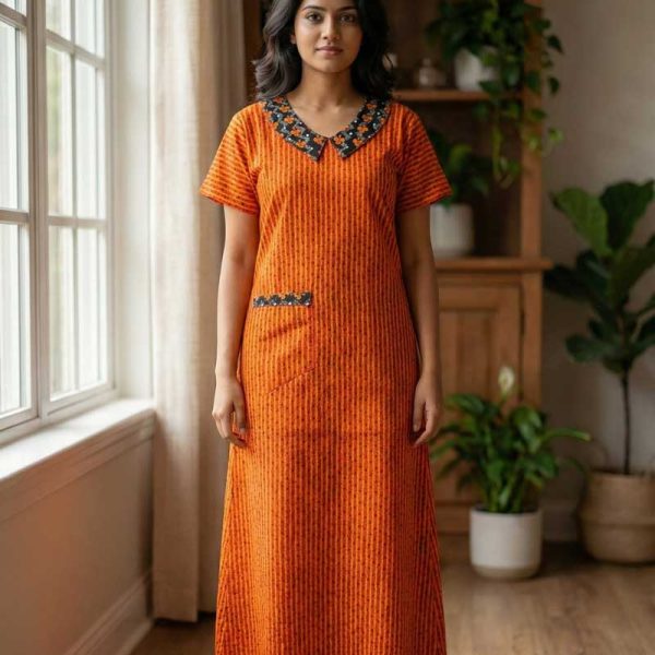 Comfortable Churidar Model Cotton Nighty, 55 Inches Long, Peter Pan Collar – Orange