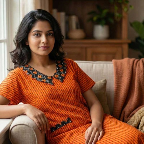 Comfortable Churidar Model Cotton Nighty, 55 Inches Long, Peter Pan Collar – Orange