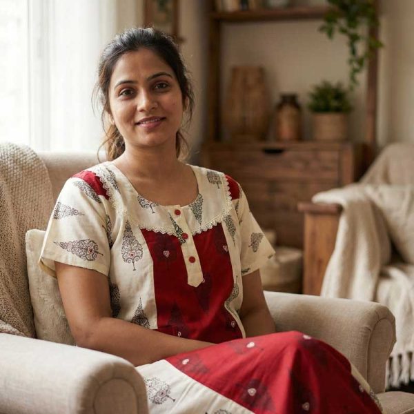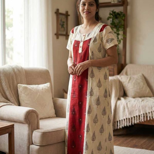 Comfortable Churidar Model Cotton Nighty – 55 Inches Long – Red + Cream