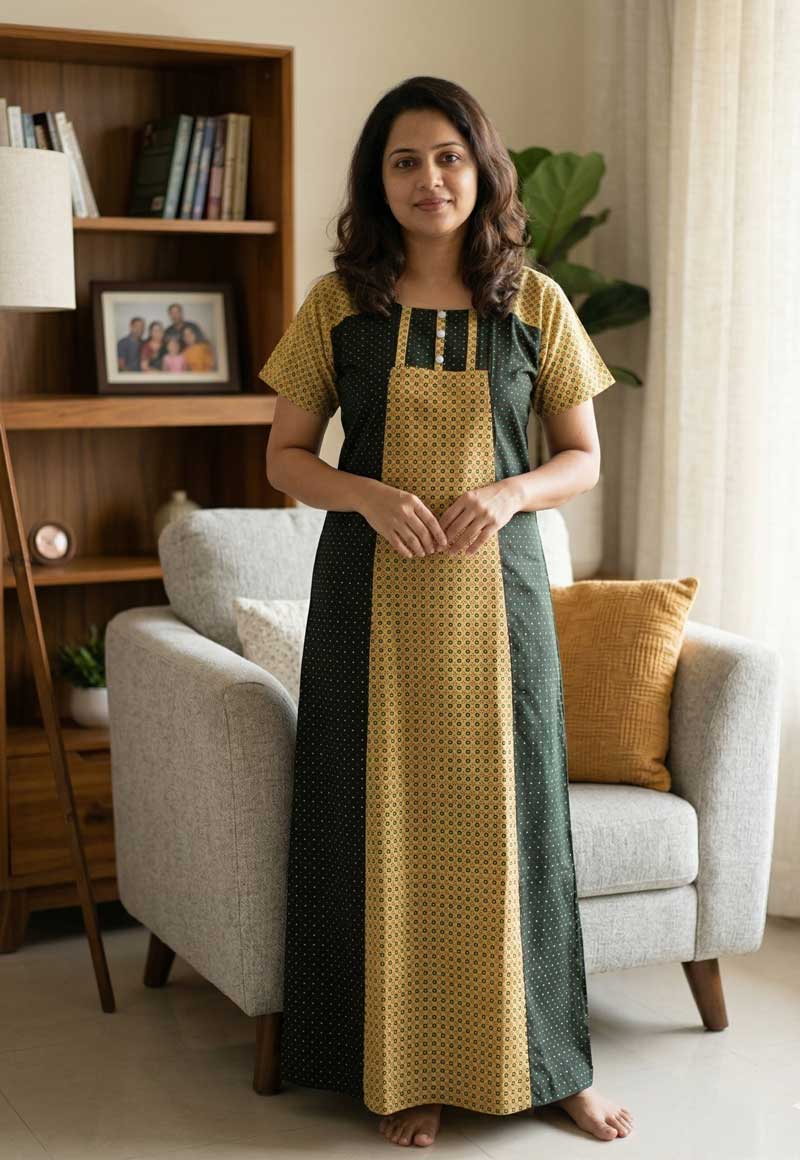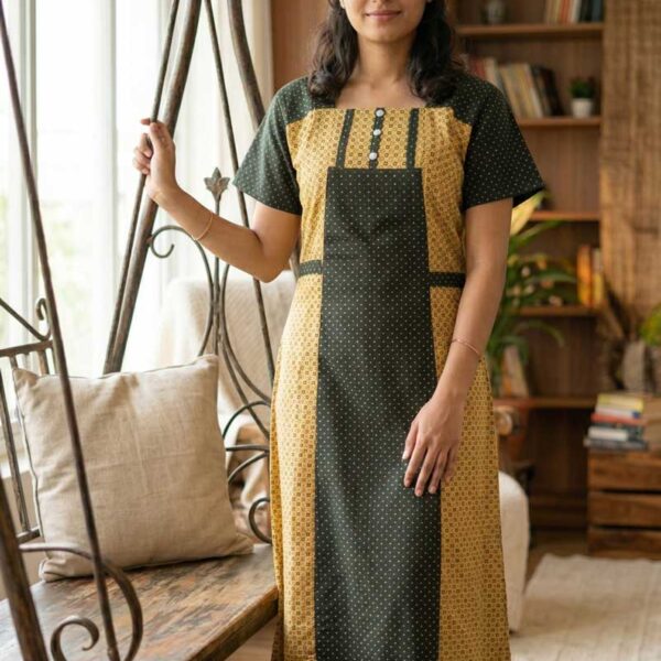 Comfortable Churidar Model Cotton Nighty, 55 Inches Long – Yellow + Dark Green