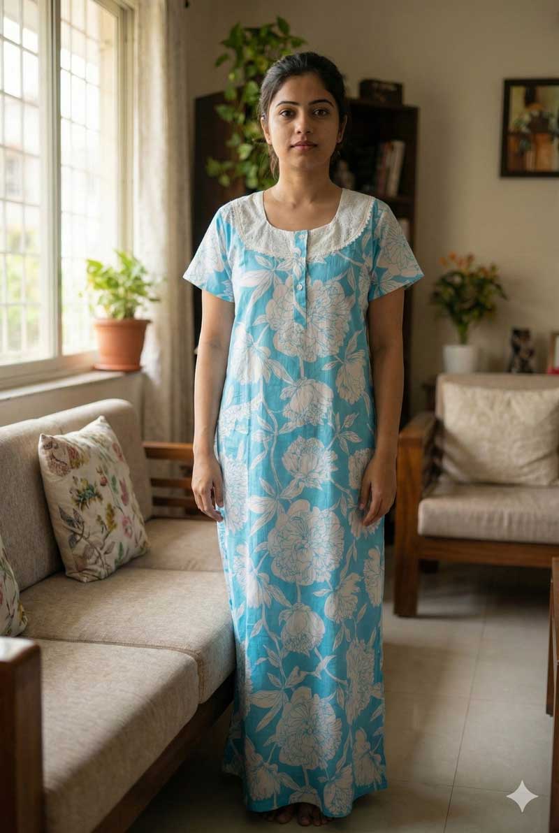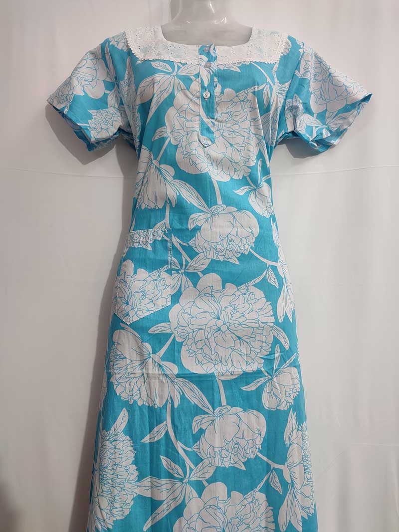 Comfortable Churidar Model Cotton Nighty, Hakoba yoke – 55 Inches Long -Blue Colour