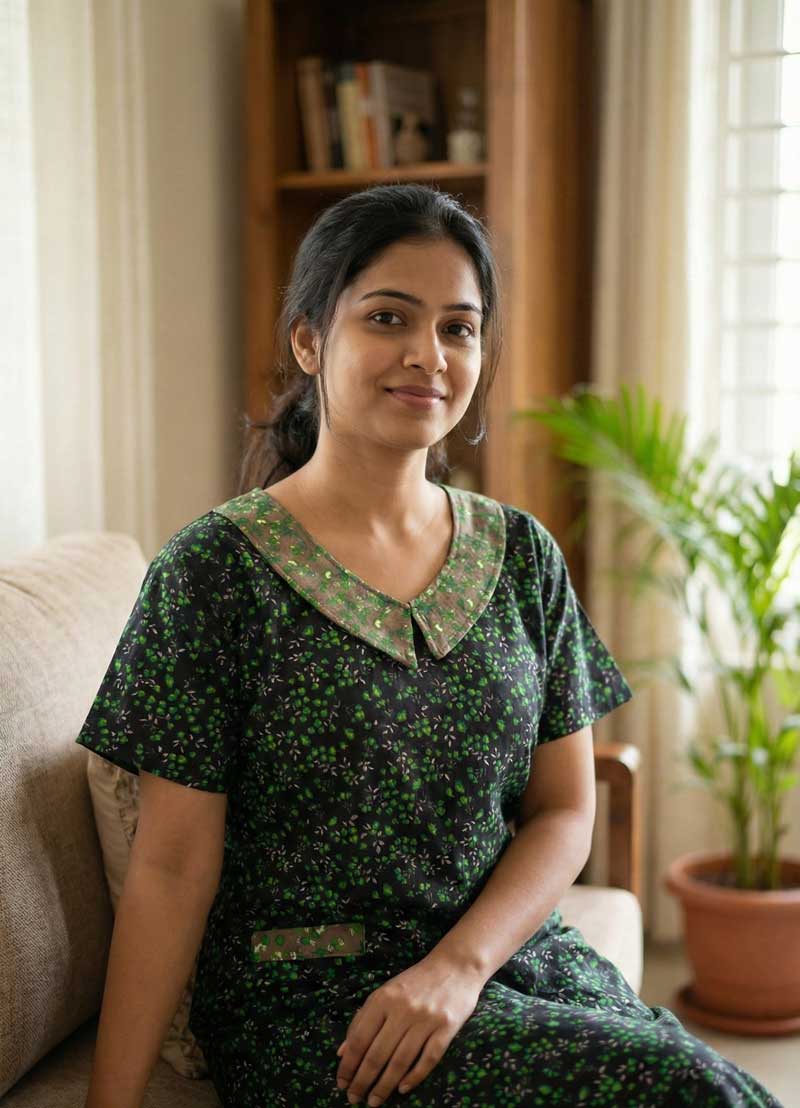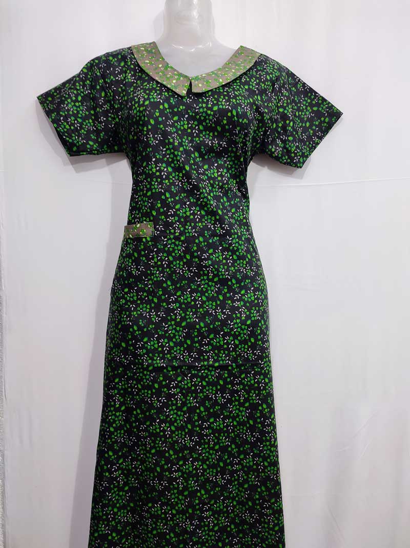 Comfortable Churidar Model Cotton Nighty with Peter-Pan Collar – 55 Inches Long – Black + Green