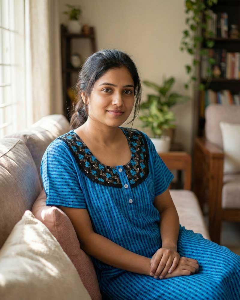 This nighty can be hand washed or a normal machine washed with cold water. Please make sure to dry the nighty in a light shade away from direct sunlight.
