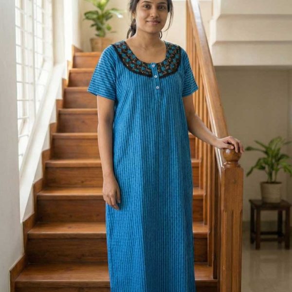 Comfortable Cotton Nighty With Buttons, 57 Inches Long – Blue