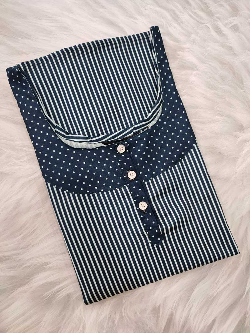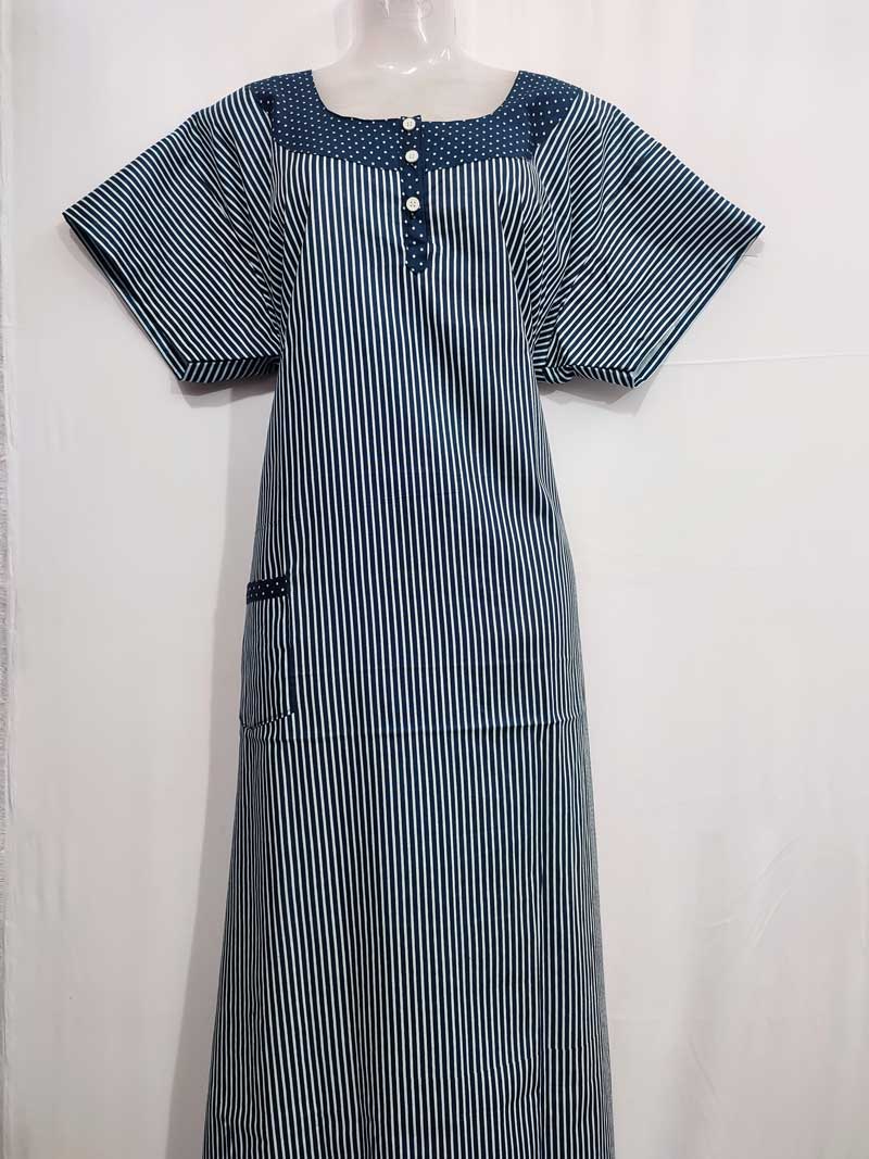Comfortable Churidar Model Cotton Nighty with Buttons – 57 Inches Long – Blue + White Line