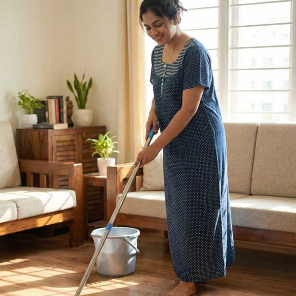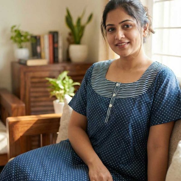 This nighty can be hand washed or a normal machine washed with cold water. Please make sure to dry the nighty in a light shade away from direct sunlight.
