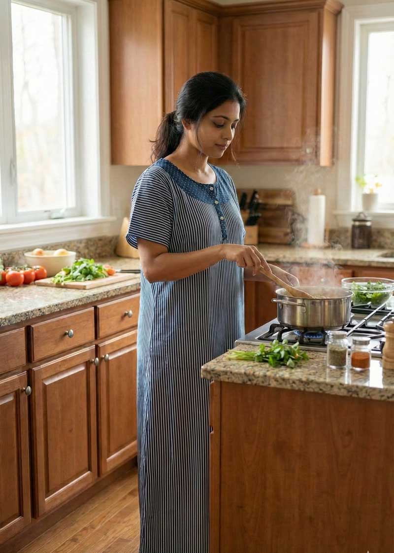 Comfortable Churidar Model Cotton Nighty with Buttons – 57 Inches Long – Brown + White lines
