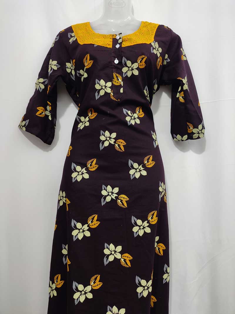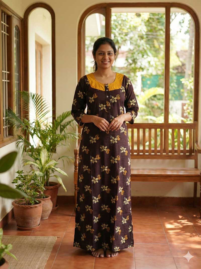 Comfortable Churidar Model Cotton Nighty with Buttons, Hakoba Yoke, 3/4th Sleeves – 55 Inches Long – Brown