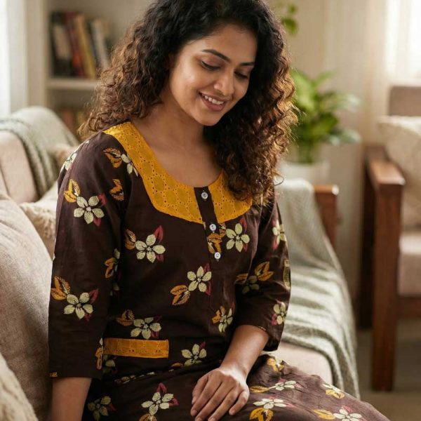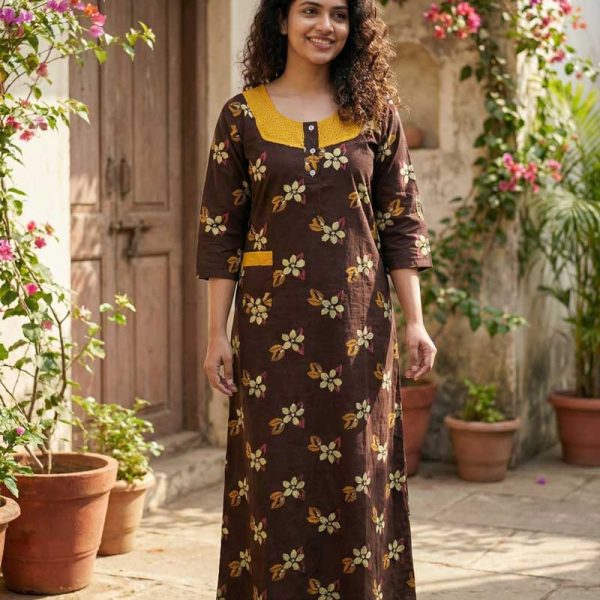 Comfortable Churidar Model Cotton Nighty with Buttons, Hakoba Yoke, 3/4th Sleeves – 55 Inches Long – Coffee Brown
