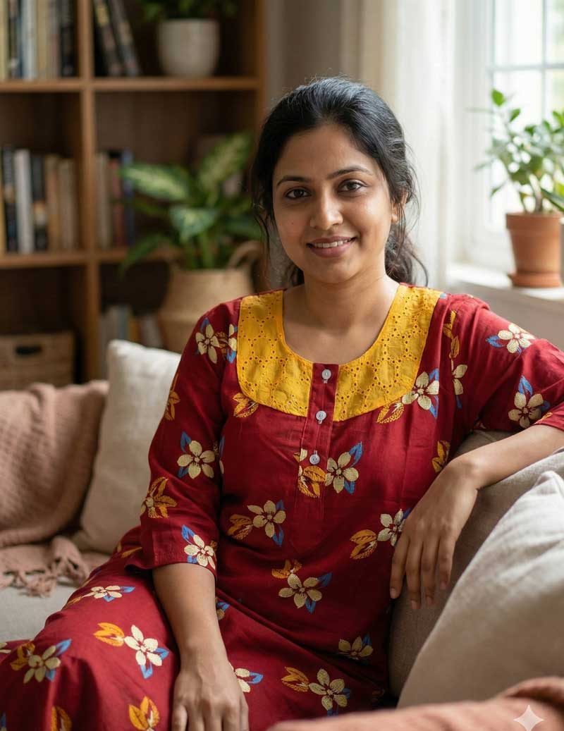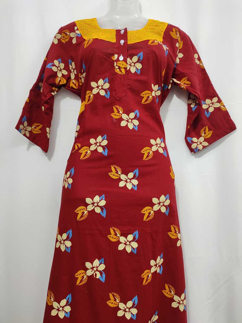 Comfortable Churidar Model Cotton Nighty with Buttons, Hakoba Yoke, 3/4th Sleeves – 55 Inches Long – Red