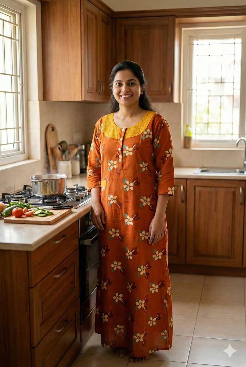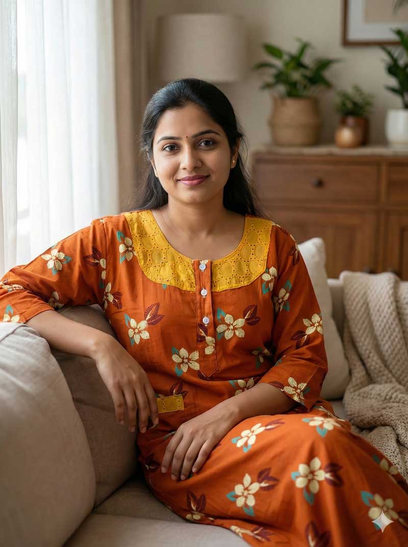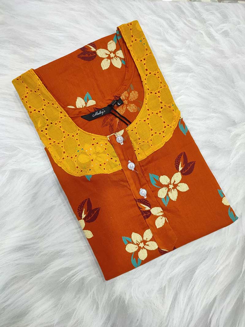 Comfortable Churidar Model Cotton Nighty with Buttons, Hakoba Yoke, 3/4th Sleeves – 55 Inches Long – Orange