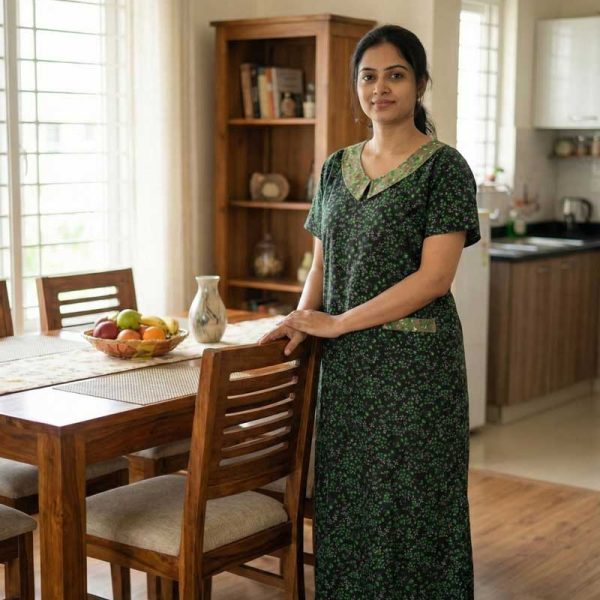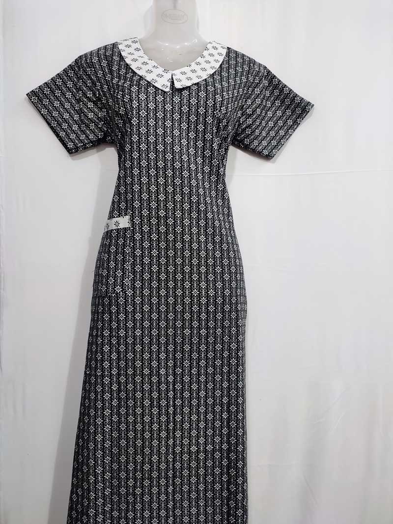 Comfortable Churidar Model Cotton Nighty with Peter-Pan Collar – 55 Inches Long – Black + Green