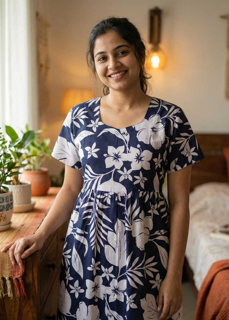 This nighty can be hand washed or a normal machine washed with cold water. Please make sure to dry the nighty in a light shade away from direct sunlight.