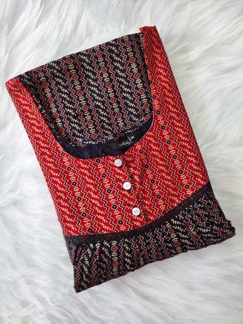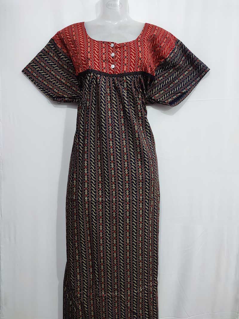 Comfortable Front Open Ajrakh Nighty With Buttons – 57 Inches long – Dark Blue + Red