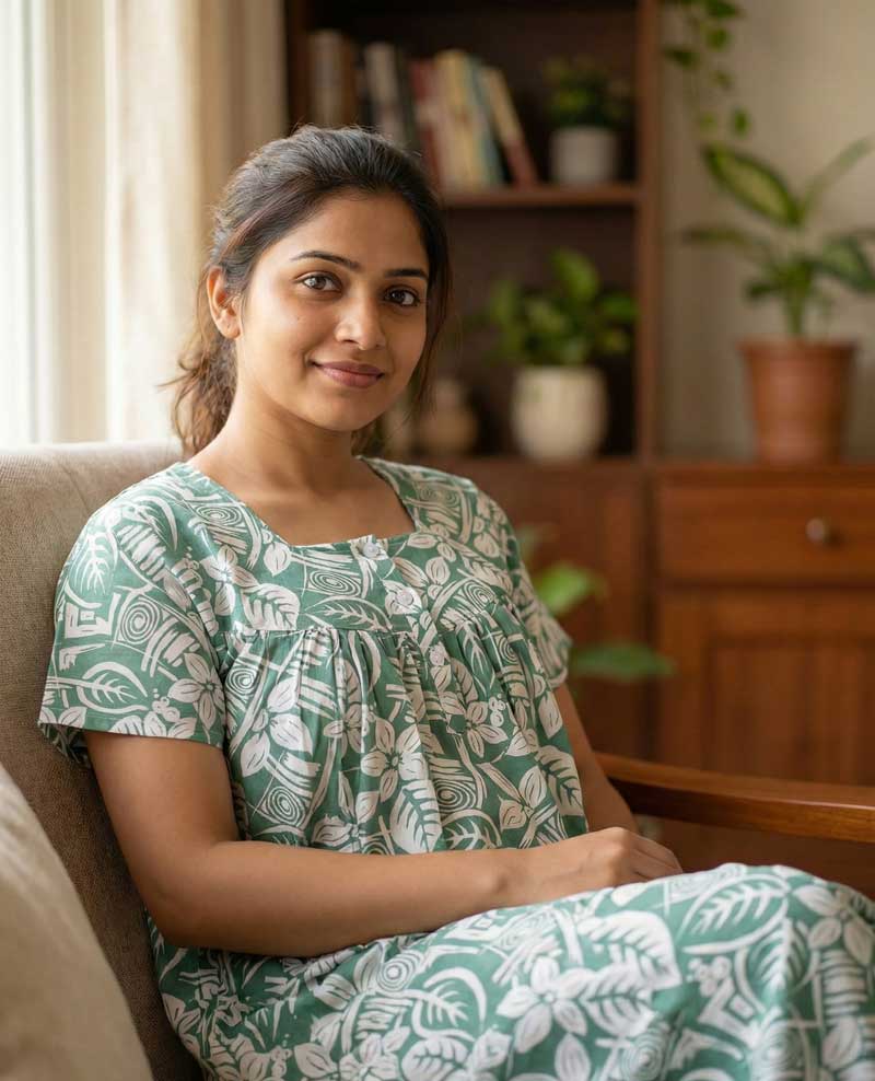 This nighty can be hand washed or a normal machine washed with cold water. Please make sure to dry the nighty in a light shade away from direct sunlight.