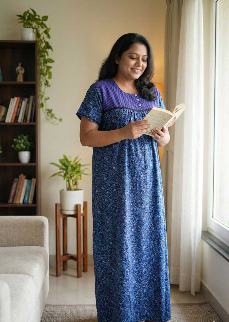 This nighty can be hand washed or a normal machine washed with cold water. Please make sure to dry the nighty in a light shade away from direct sunlight.