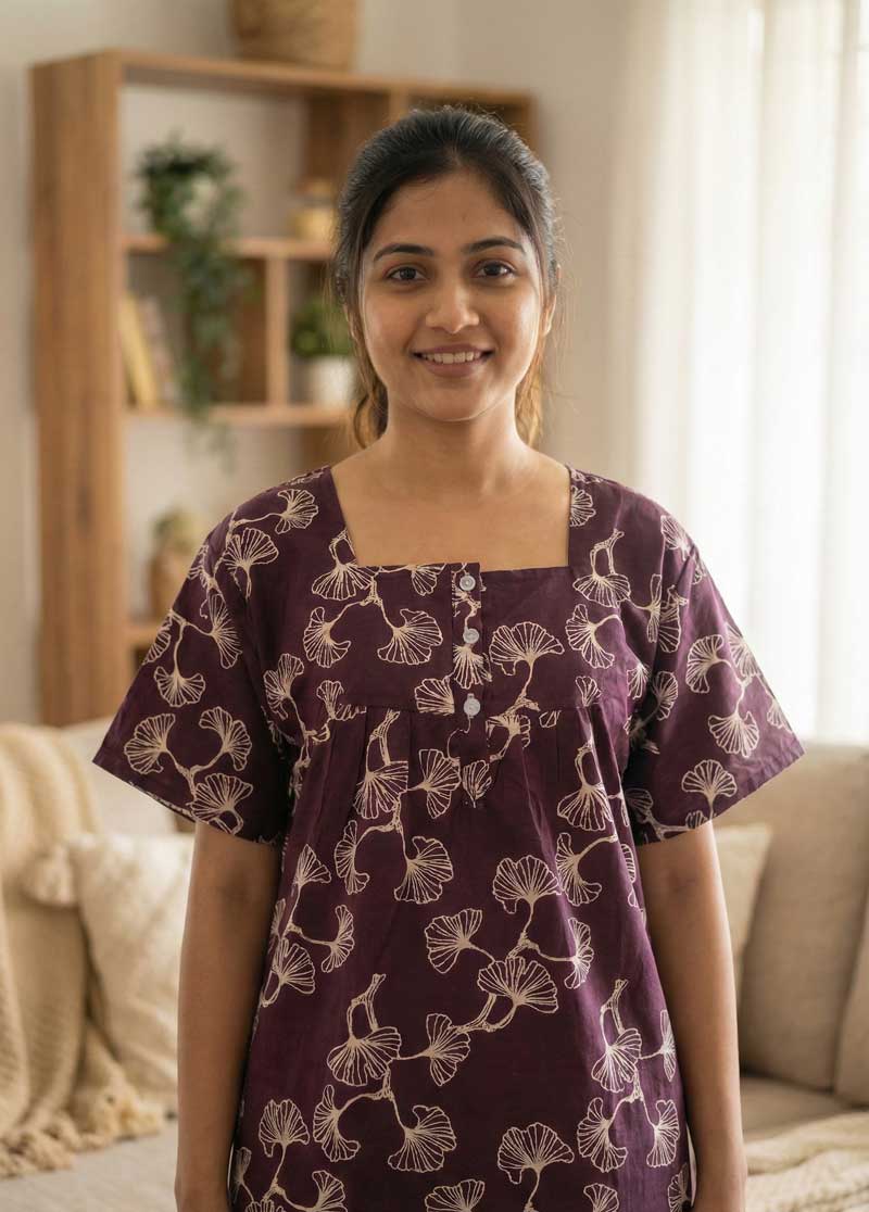 This nighty can be hand washed or a normal machine washed with cold water. Please make sure to dry the nighty in a light shade away from direct sunlight.