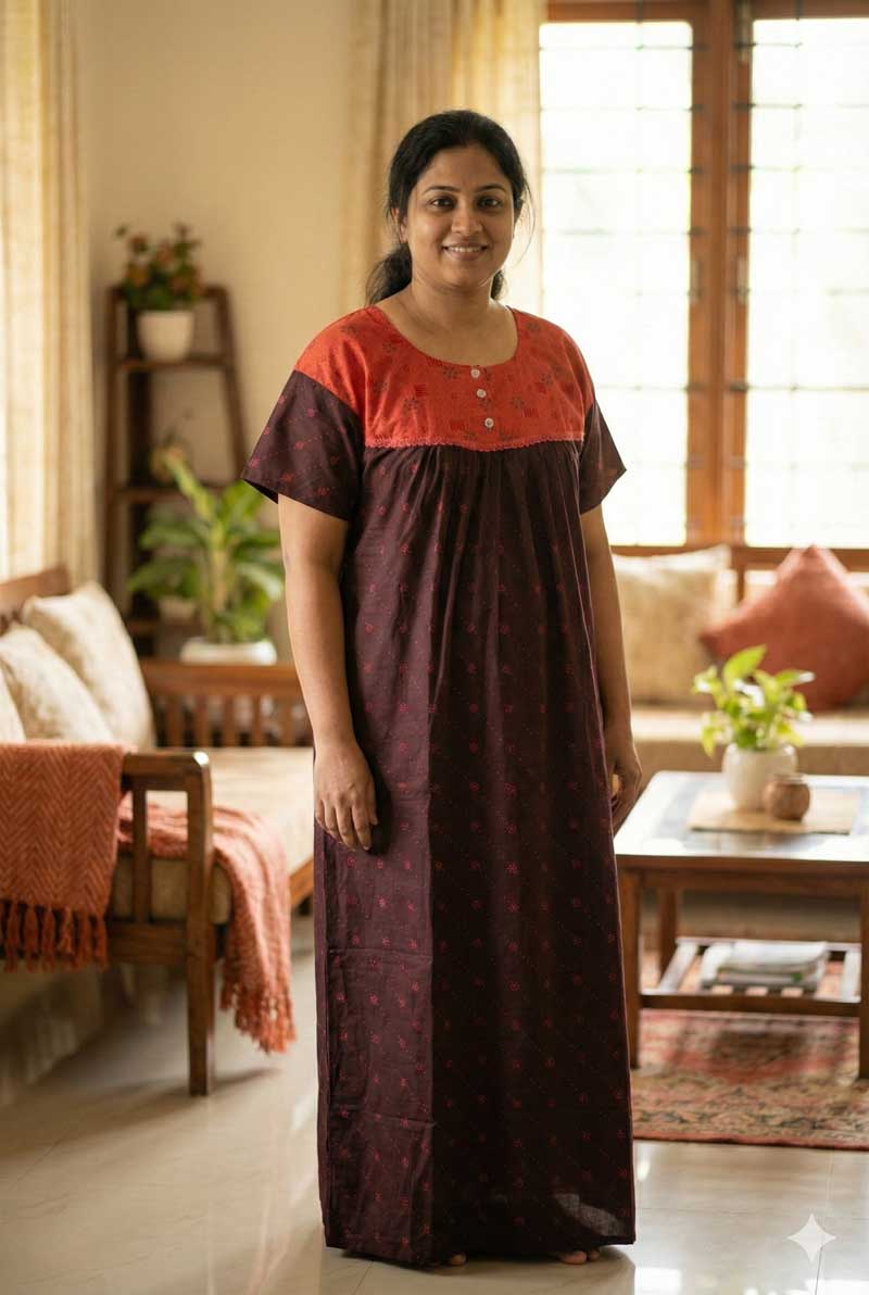 Traditional Cotton Nighty , 55 Inches Long – Brown