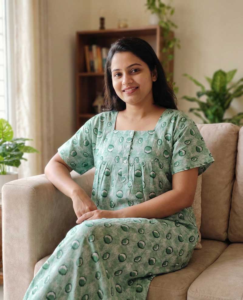 This nighty can be hand washed or a normal machine washed with cold water. Please make sure to dry the nighty in a light shade away from direct sunlight.