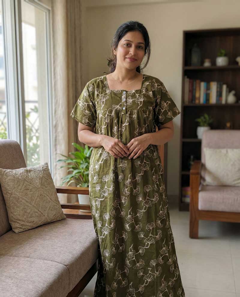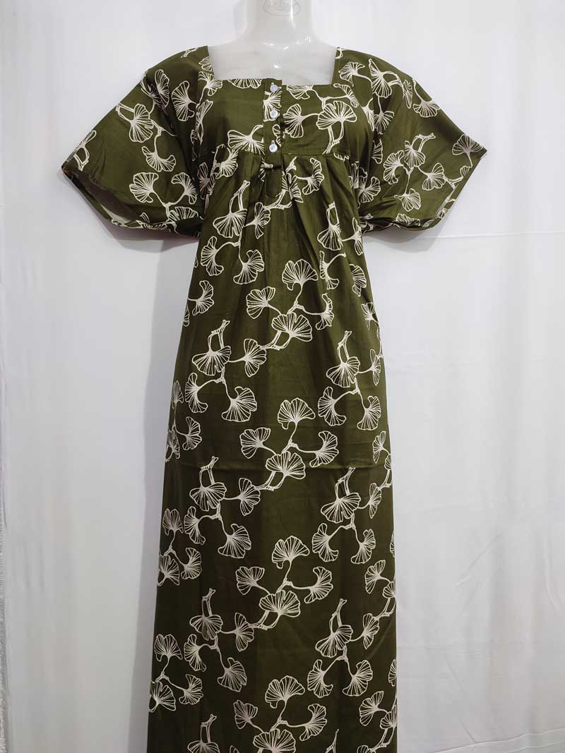 Comfortable Front Open Cotton Nighty With Buttons- 57 inches long -Olive Green