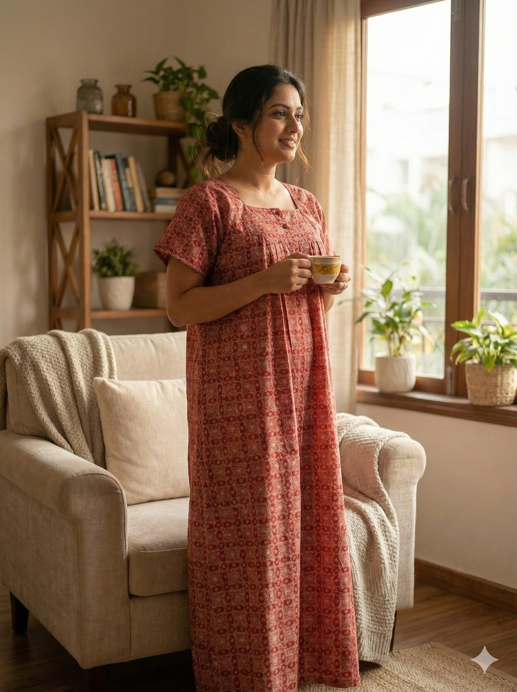 ₹499Comfortable cotton nighty with long sleeves- 55 inches long – Rose